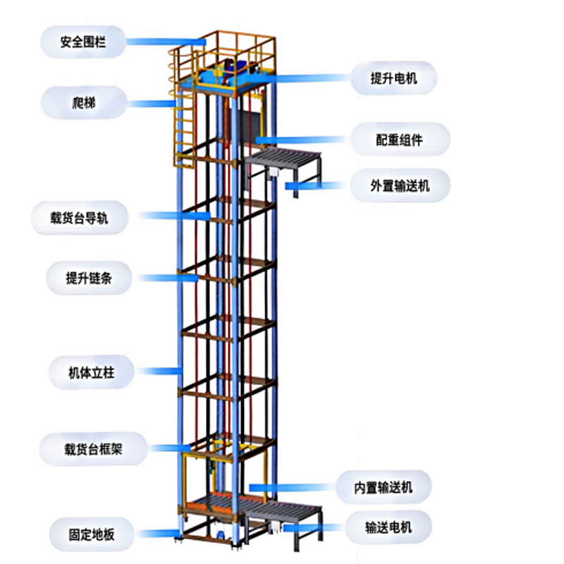 本款托盤垂直提升機采用四立柱堅固結構,專為自動化搬運重型托盤而設計,適用于多層倉儲、立體庫、分揀中心和生產(chǎn)車間等多種工業(yè)場景。其強